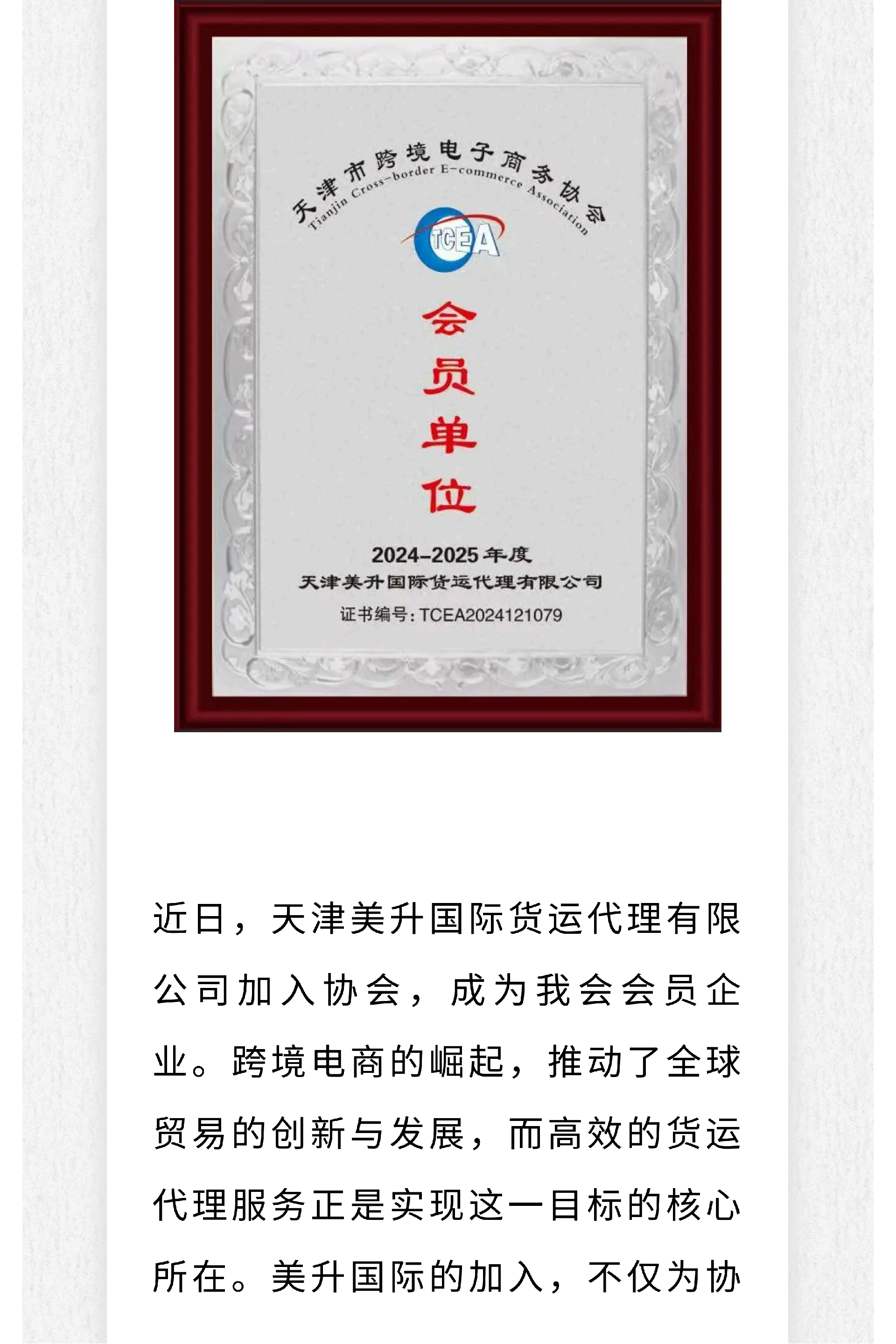 欢迎天津美升国际货运代理有限公司加入协会!