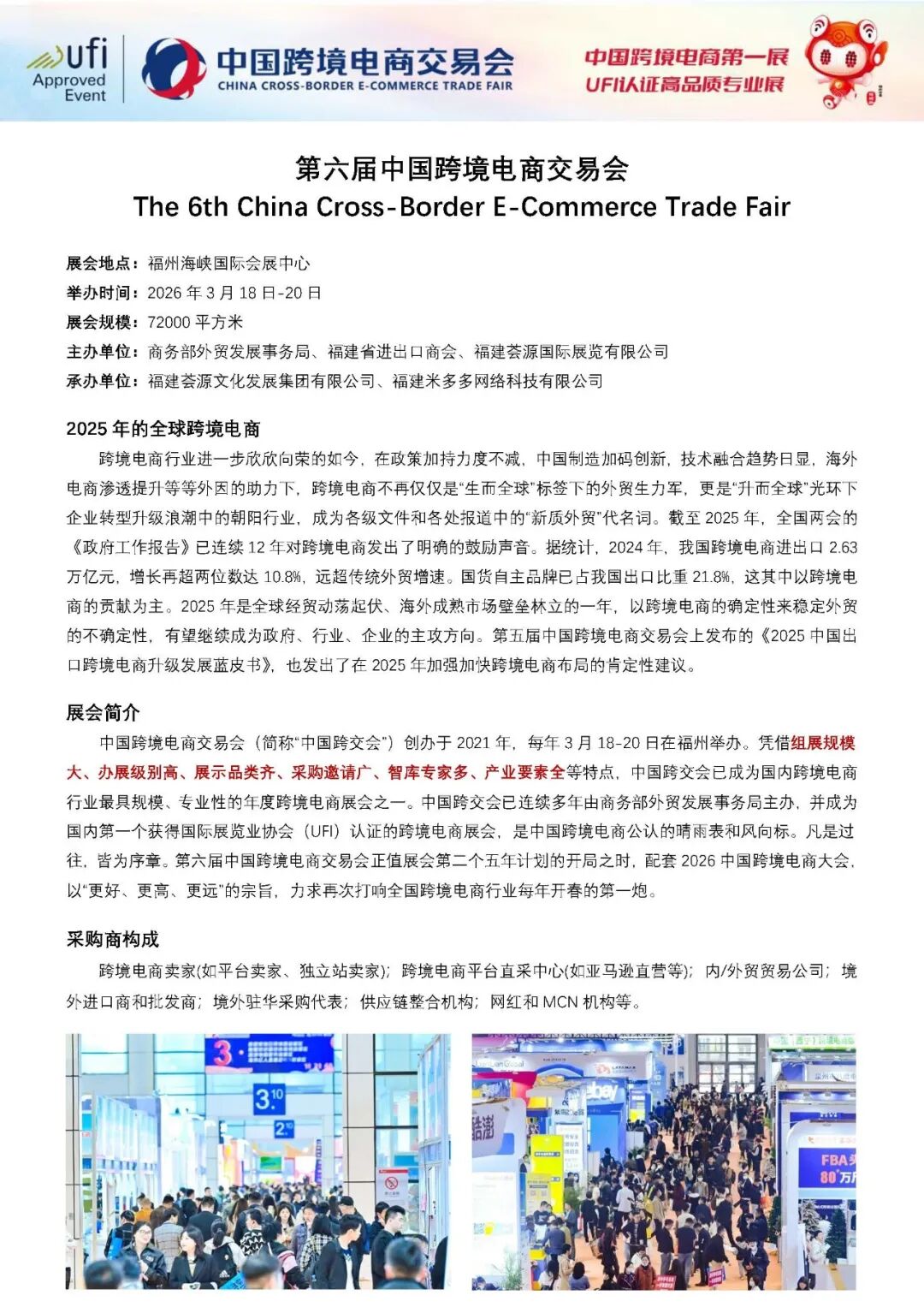 为助力企业紧跟全球跨境电商发展浪潮,拓展海外市场资源,天津市跨境电子商务协会作为第六届中国跨境电商交易会的合作单位,现诚邀各单位积极参展。展会将于2026年3月18日-20日在福州海峡国际会展中心隆重举行,展览规模达72000平方米,作为国内最具规模与专业性的年度跨境电商盛会,中国跨交会自创办以来凭借其权威性、前瞻性与实效性,已成为行业发展的风向标。在政策持续加码、中国制造创新升级的当下,跨境电商正成为企业转型与外贸稳定的中坚力量。