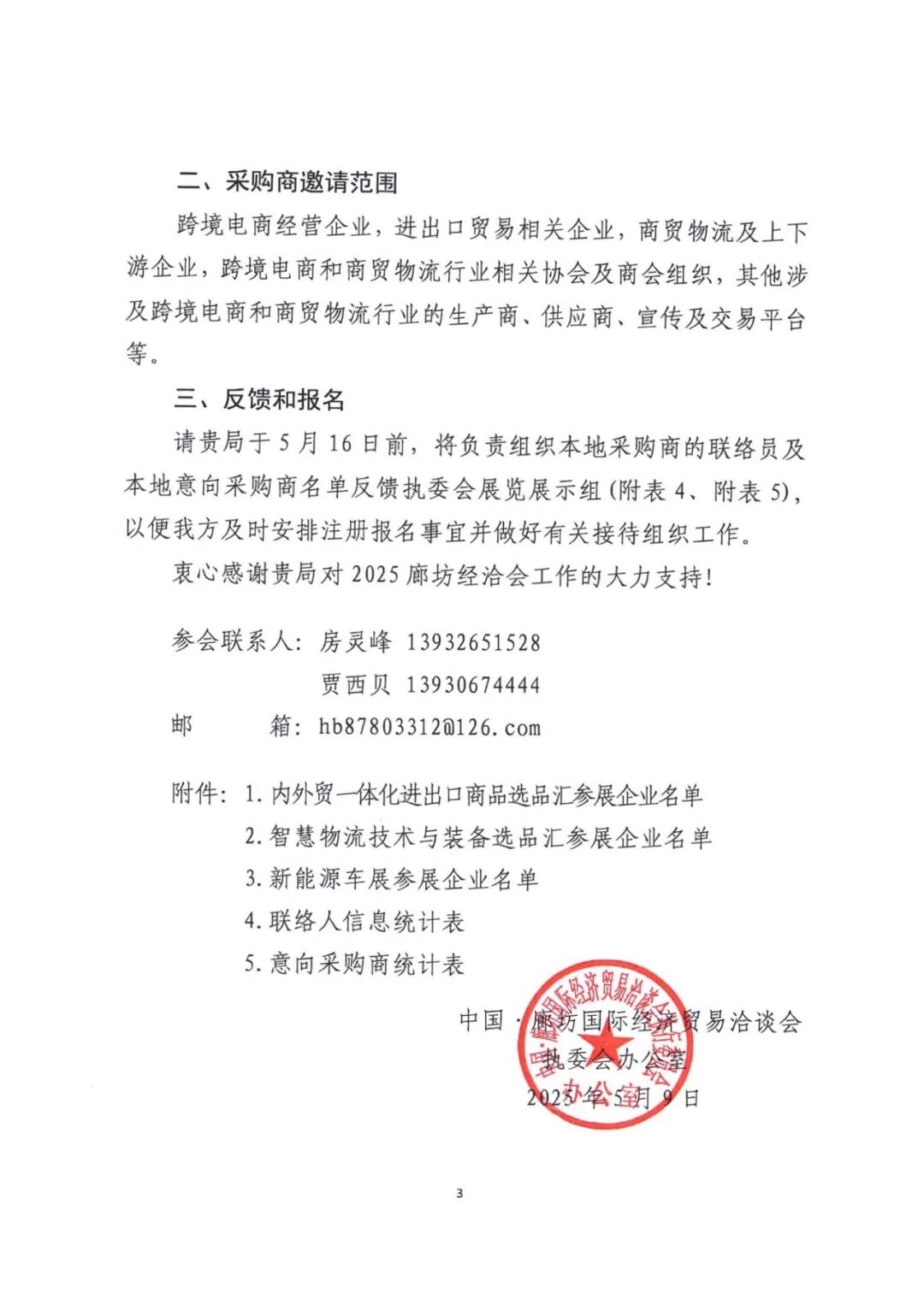 点击蓝字 关注我们 各相关企业: 2025年中国·廊坊国际经济贸易洽谈会(以下简称“廊坊经洽会”)拟于2025年6月16日至20日在河北省廊坊市临空国际会展中心举办。廊坊经治会由河北省人民政府主办,是全国唯一以现代商贸物流为主题的专业博览会,大会着眼落实京津协同发展重大战略,立足河北建设全国现代商贸物流重要基地功能定位,以推动全社会物流降本提质增效为核心目标,广泛聚集全球现代商贸物流领域高端资源,倾力打造专业化、国际化、品牌化经贸交流平台。为促进地区经贸交流、加强区域经济合作,共享大会洽谈成果,特邀请各企业参会,洽谈合作。 扫描二维码填写资料进行申请报名 参会联系人:房灵峰13932651528 贾西贝13930674444 邮箱:hb878033120126.com 附件:1.内外贸一体化进出口商品选品汇参展企业名单 2.智慧物流技术与装备选品汇参展企业名单 3.新能源车展参展企业名单 4.联络人信息统计表 5.意向采购商统计表 点击链接查看附件: 关于组织天津采购商参加2025年中国·廊坊国际经济贸易洽谈会的函.pdf 天津市跨境电子商务协会 2025年5月21日 合作平台 (排名不分先后) 部分理事会成员 (排名不分先后) 部分会员单位 (排名不分先后)