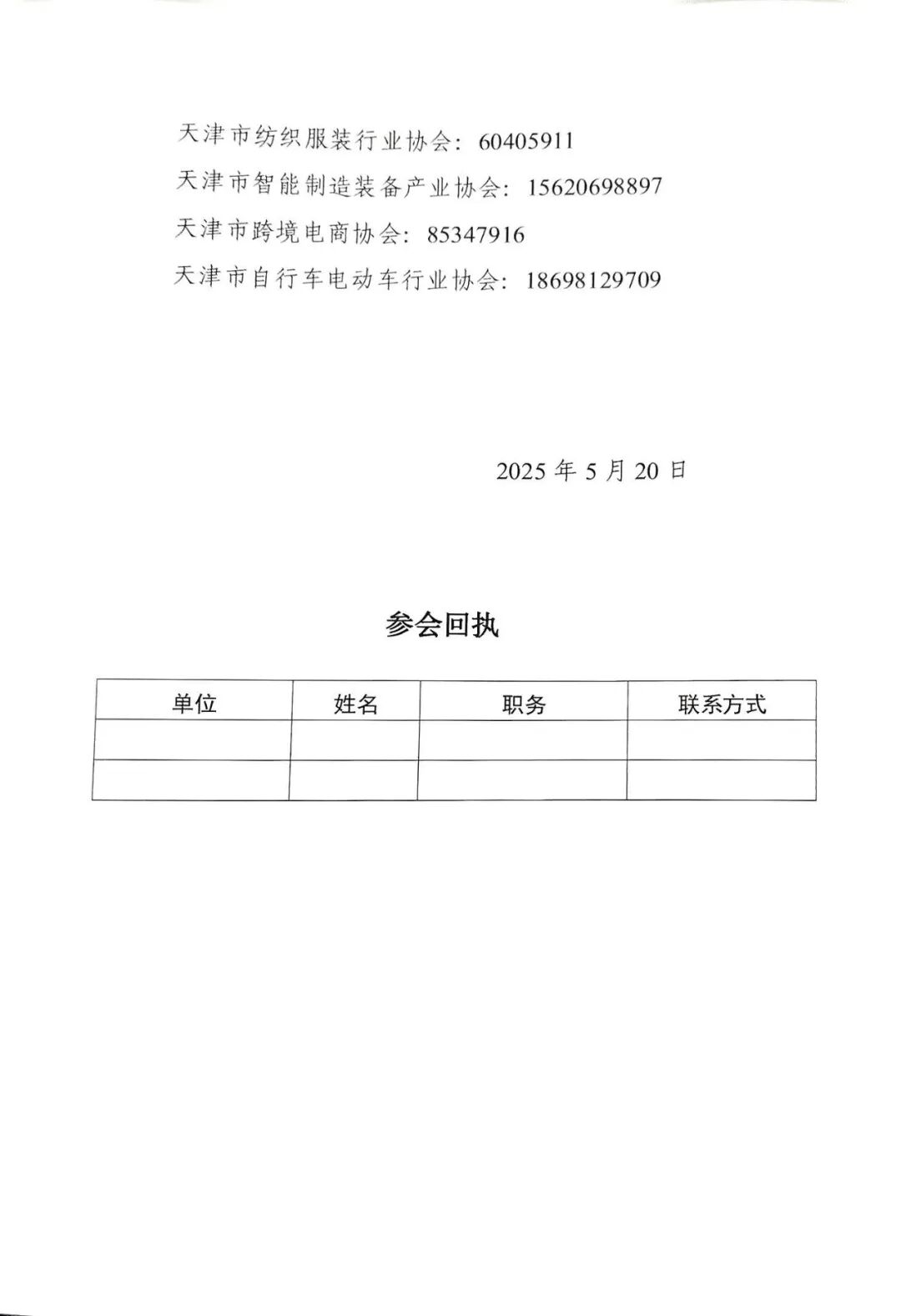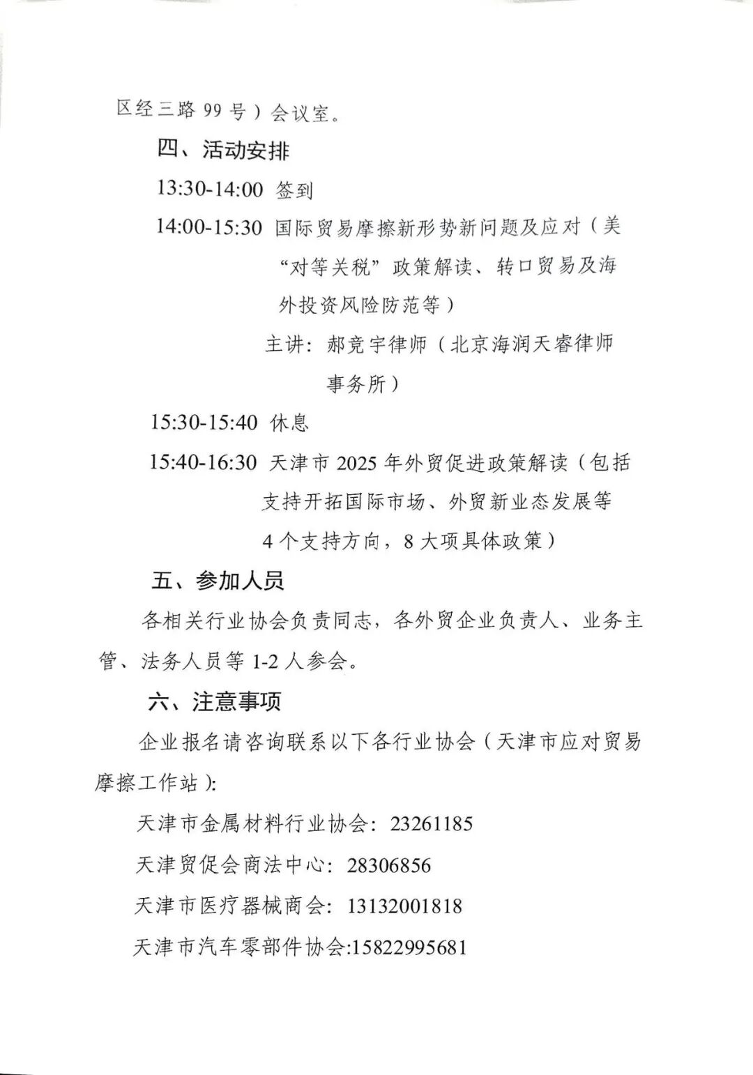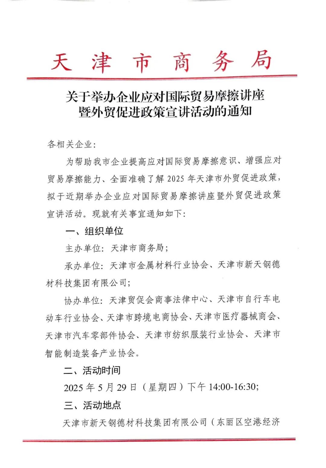 点击蓝字 关注我们 各相关企业: 为帮助企业提高应对国际贸易摩擦意识、增强应对贸易摩擦能力、全面准确了解2025年天津市外贸促进政策,市商务局拟于近期举办企业应对国际贸易摩擦讲座暨外贸促进政策宣讲活动。协会作为此次活动的协办单位,我们高度重视会员企业的成长与发展,特向大家转发此通知,诚挚邀请各会员企业积极参与此次活动。 参会企业扫码填写报名表 点击链接查看原文:讲座暨宣讲活动通知.pdf 天津市跨境电子商务协会 2025年5月22日